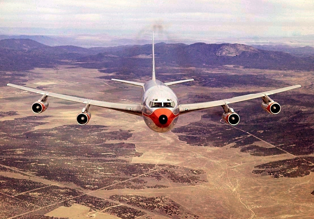 According to the former Boeing photographer who took this in (he thinks) 1959, it was snapped from the boom operator’s station of a KC-135 Stratotanker. Makes sense to me, because I sure can’t figure out how else you get a head-on shot of an airliner doing a few hundred knots (and live to tell about it).