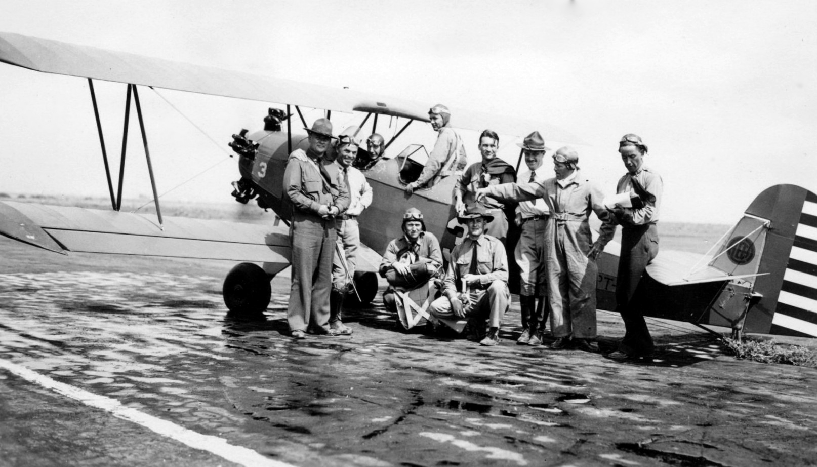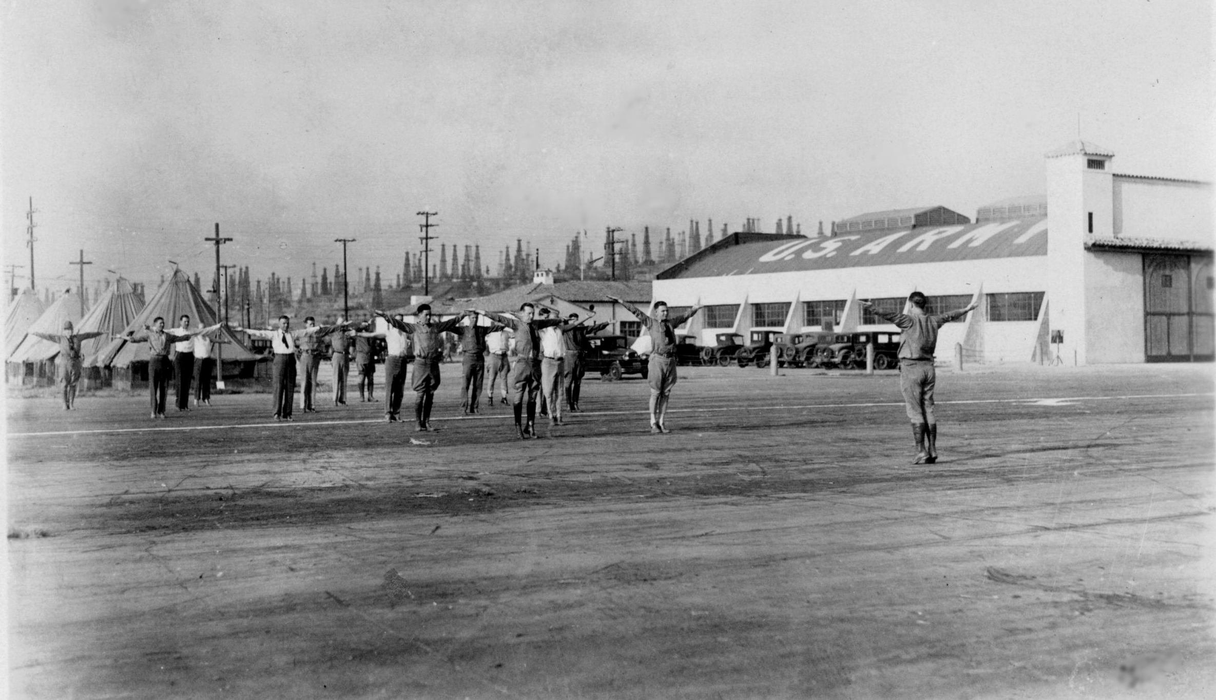 “And on the plane, we call these ‘wings’.” Some basic flying techniques are taught next to the Air Corps hangar at Long Beach. The oil rigs on Signal Hill in the background gave it the nickname “Porcupine Hill.”