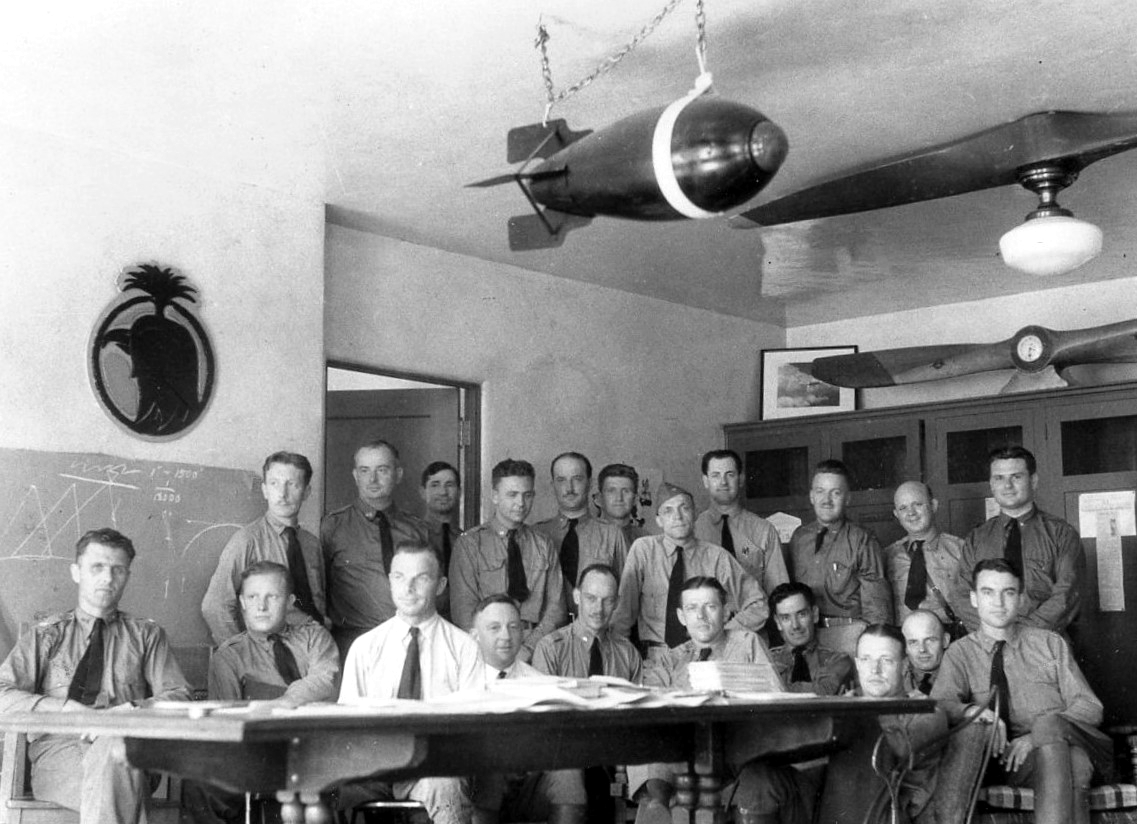 Officers of the 476th at March Field. The building is the officer’s club, and is still in use today as the “Hap Arnold Club”. The list of famous names who have bent an elbow at the bar is too long for counting. (Been there a time or two, and to Sally’s Alley out back.)
