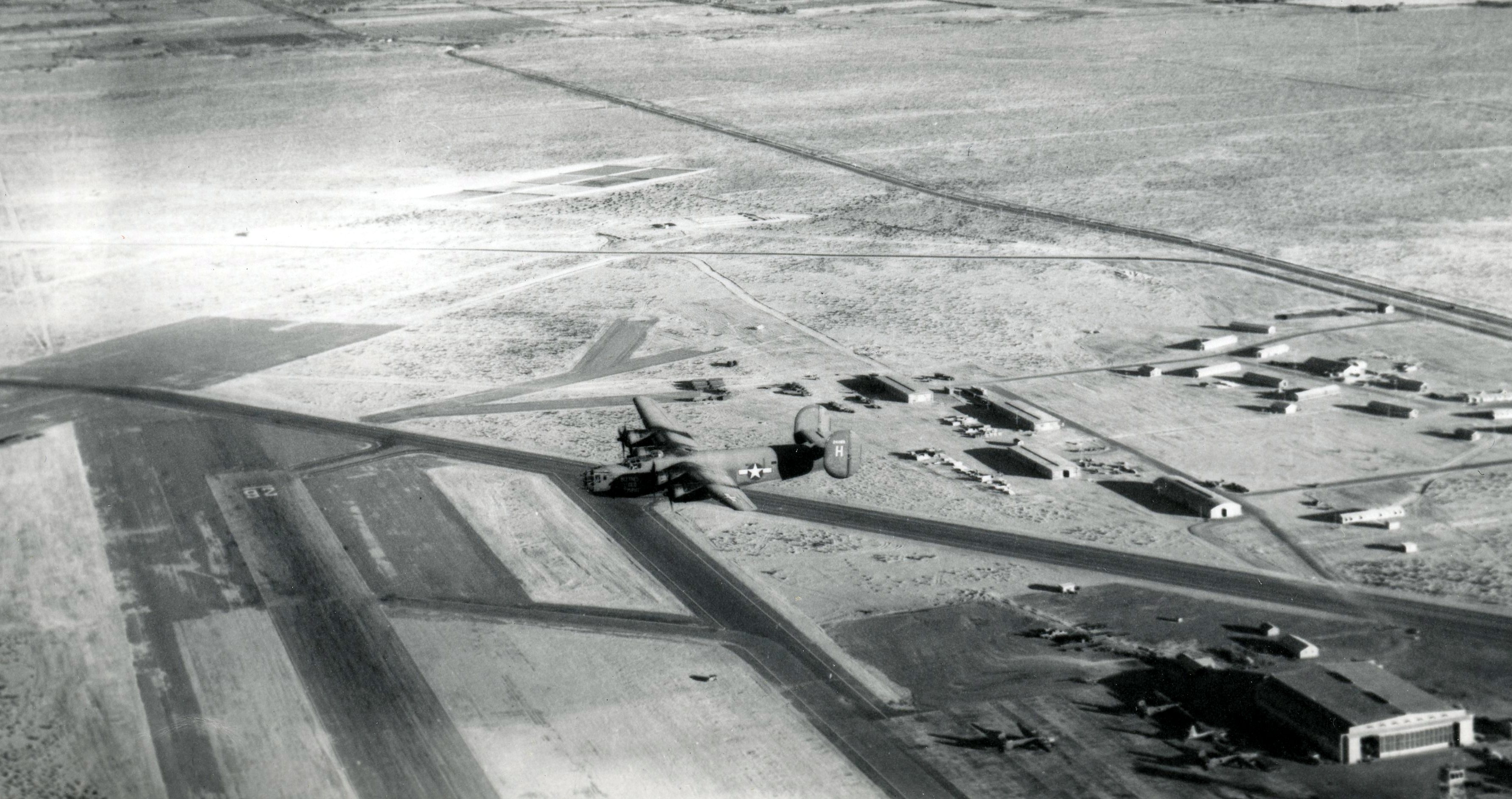 Took some searching to discover that this is Blythe Army Airfield in Calif. The B-24 is from the 34th Bomb Group. Despite being advertised as “The world’s healthiest airbase”, Blythe closed with the war’s end. Note: From my experience in the USAF, anytime a base is promoted as being the “healthiest”, the “best kept secret” (etc.), it is usually a place most people would choose not to reside.