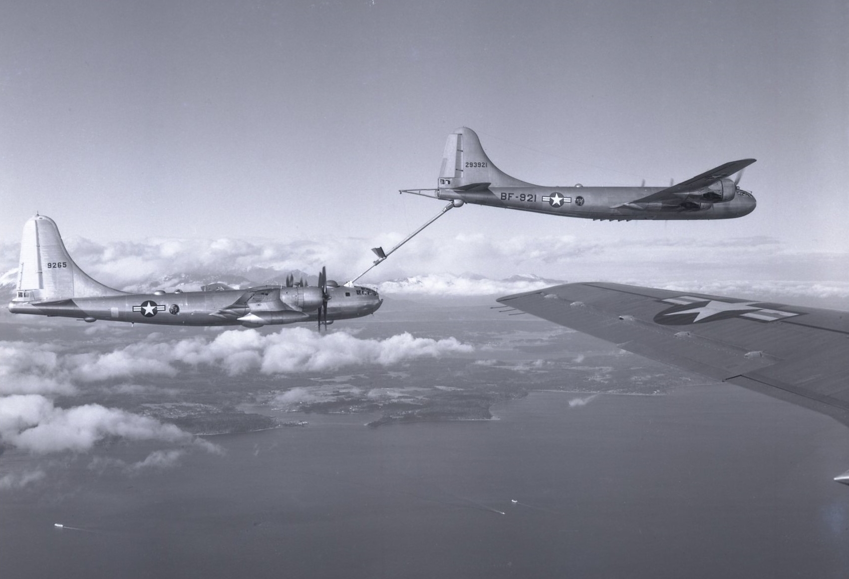 Early days of air refueling thejivebombers US Air Force January 30, 2018April 20, 2020 1 Minute B-50 hooks up to a KB-29P during air refueling tests over Puget Sound. (Bainbridge island in the background). This B-50, 49-265, was eventually converted in to a tanker itself. The KB-29, 42-93921, started life as a bomber but never saw combat. Share this: Click to share on X (Opens in new window) X Click to share on Facebook (Opens in new window) Facebook Like Loading... Related Published by thejivebombers View all posts by thejivebombers Published January 30, 2018April 20, 2020