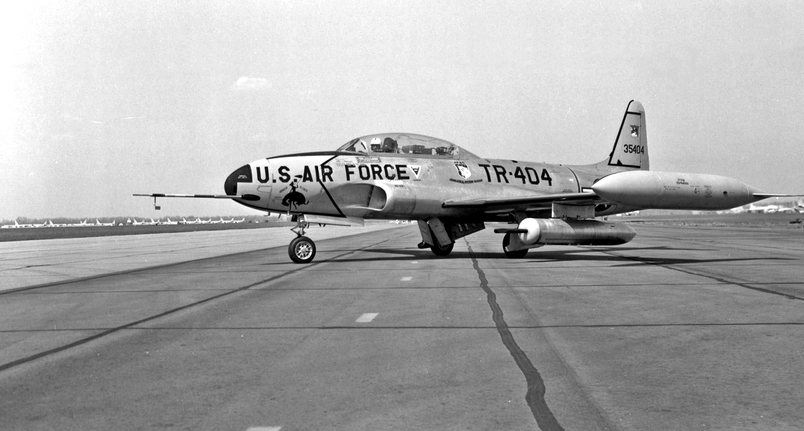 The Lockheed T-33 literally came in all shapes and sizes. This one (53-5404) is from Air Force Systems Command (AFSC) at Wright-Patterson AFB, and says “Project Rough Rider” on the nose. For a good reason too: It flew in to storms to measure the effects of hail. Though the insignia is that of Air Research and Development Command (ARDC), above it are the letters “AFSC”, the successor of ARDC. Apparently they hadn’t gotten around to putting on the new insignia. B-52’s of the 17th Bomb Wing are in the distance.