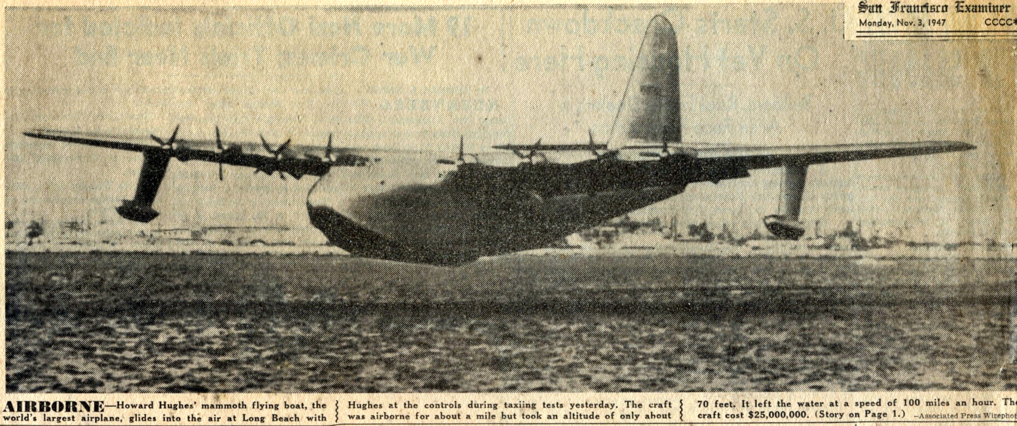 We’ve all seen the Spruce Goose on its one and only flight… thejivebombers Civil Aviation May 14, 2018April 28, 2020 1 Minute …but here is the newspaper story from when it all happened. San Francisco Examiner, November 3, 1948. Share this: Click to share on X (Opens in new window) X Click to share on Facebook (Opens in new window) Facebook Like Loading... Related Published by thejivebombers View all posts by thejivebombers Published May 14, 2018April 28, 2020
