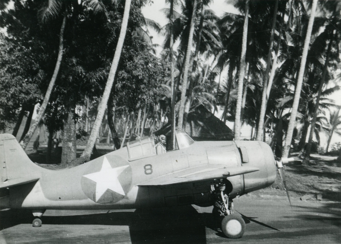 Early days in the South Pacific. The Wildcats Ford flew were ex-USS Lexington aircraft that recovered aboard USS Yorktown at Coral Sea when the former carrier was aflame. Given that the Yorktown had more Wildcats than it needed, the “surplus” Lexington aircraft were handed to the Marines. Pictured are two of those aircraft, F4F-3’s with non-folding wings. The new -4’s (folding wings) had arrived in the fleet, and the older “hard wing” birds were fine by the Marines on land.