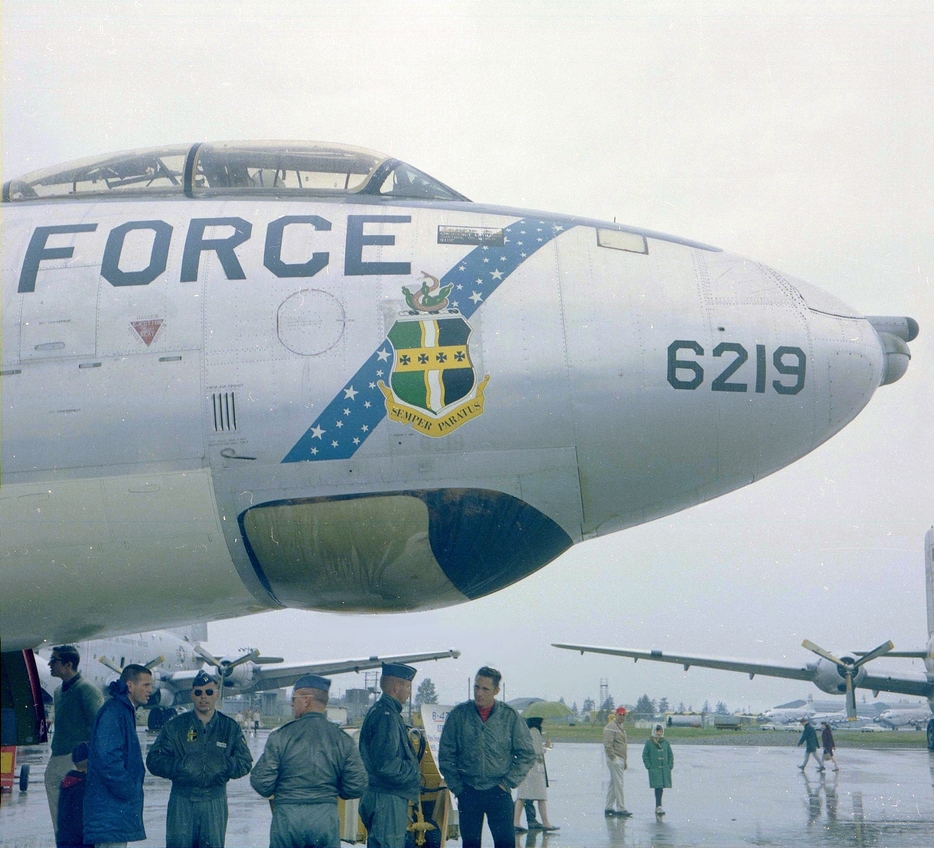 It is a rainy day at McChord AFB, but such weather never deters the die-hard aircraft fans. B-47E 53-6219 – as with all Stratojets – was nearing the end of its days when this photo was taken in 1963, but it could still draw admirers. (Made a good umbrella too) This 9th Strategic Aerospace Wing aircraft was visiting from Mountain Home AFB, a place where rain is less a concern than dust and tumbleweeds.