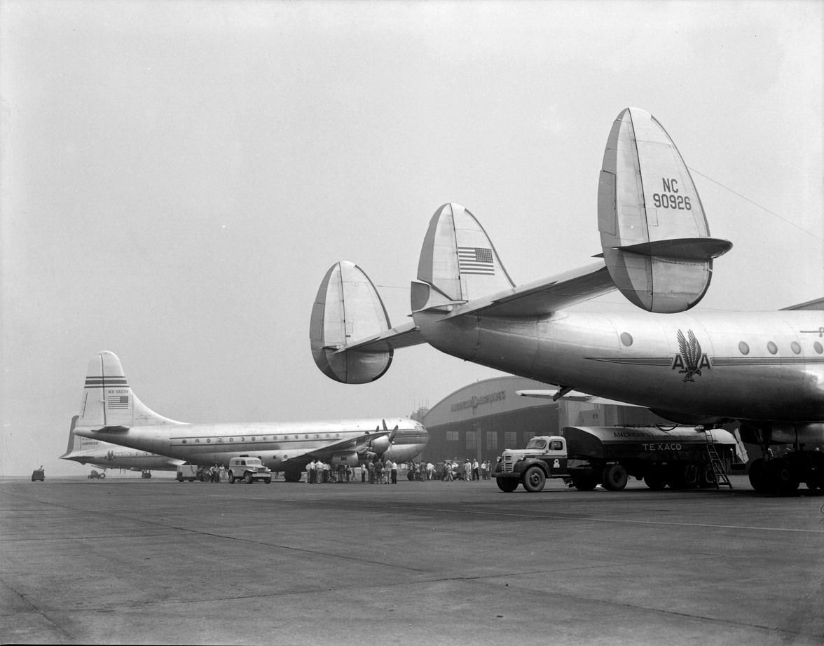Super Connie NC90926 (“Star of Tunis”) heads an all-star ensemble of American Airlines heavies. B-377 Stratocruiser (NX1023V, “Clipper Golden Gate”) is next. It was the second prototype of the 377 and, judging by its lack of company markings plus the sizable crowd, had probably just arrived. Sadly, it crashed in Manila on 2 June, 1958. Last in the line is the stalwart DC-6.