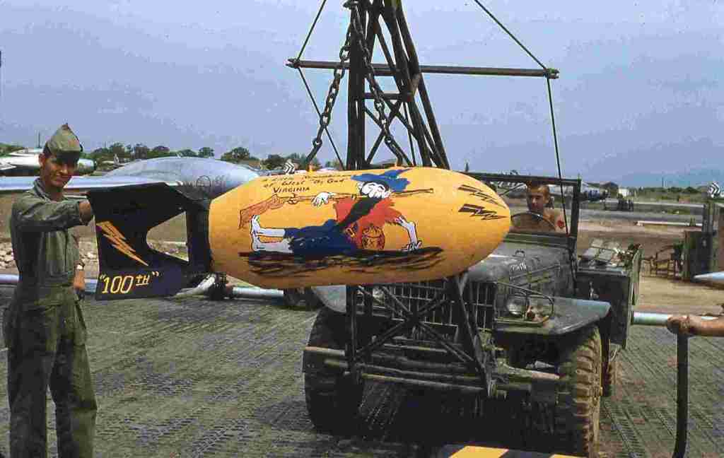 The happy day arrives for three pilots of the 8th Fighter Bomber Squadron: They have flown their 100th mission, and will soon be heading home. A slight curiosity: the rearmost plane reads “456” on the fuselage, but the tail says “51-1135”. Wonder what that story is.Special 100 Mission bomb is readied at the Taegu bomb dump. Besides the Hillbilly paint job, the bomb also reads “A Little Remembrance of West ‘By God’ Virginia”.