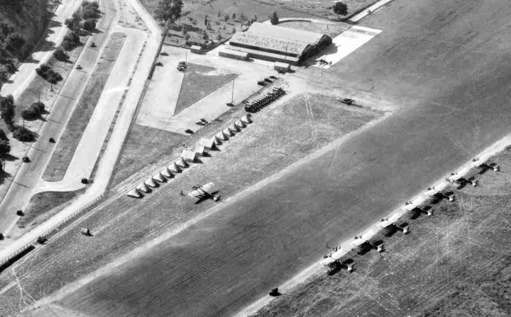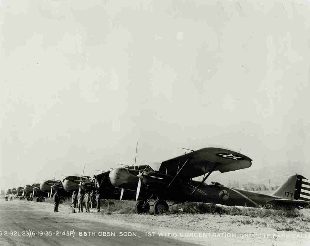 Los Angeles’ Griffith Park Aerodrome/Airport/Field, home to the 115th Observation Squadron, California National Guard, was one of countless airfields that dotted the area in the 1920s & 30s (note Glendale Airport in the upper right of the photo). As a military airfield, Griffith Park was host to a variety of different aircraft, such as the ones seen in these photos, Douglas Y10-35/Y1B-7s. Only a dozen of these planes were built, and most of them are seen here, parked along the runway’s edge. The aircraft are visitors from the 88th Observation Squadron, Brooks Field, Texas, the occasion is the “1st Wing Concentration”, an Air Corps exercise that involved numerous airplanes and airfields assigned to that Wing. A close inspection of Glendale Airport in photo #1 shows that they, too, have a line-up of Air Corps planes.