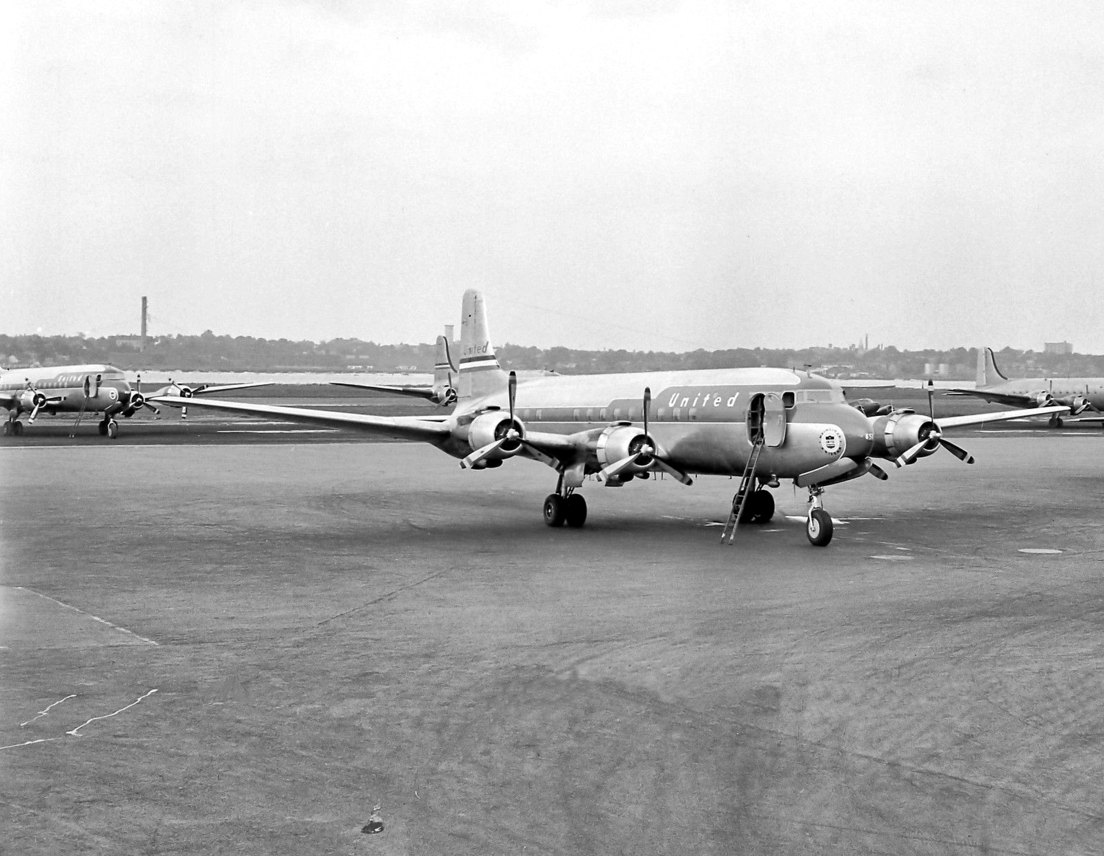 Super Connie NC90926 (“Star of Tunis”) heads an all-star ensemble of American Airlines heavies. B-377 Stratocruiser (NX1023V, “Clipper Golden Gate”) is next. It was the second prototype of the 377 and, judging by its lack of company markings plus the sizable crowd, had probably just arrived. Sadly, it crashed in Manila on 2 June, 1958. Last in the line is the stalwart DC-6.