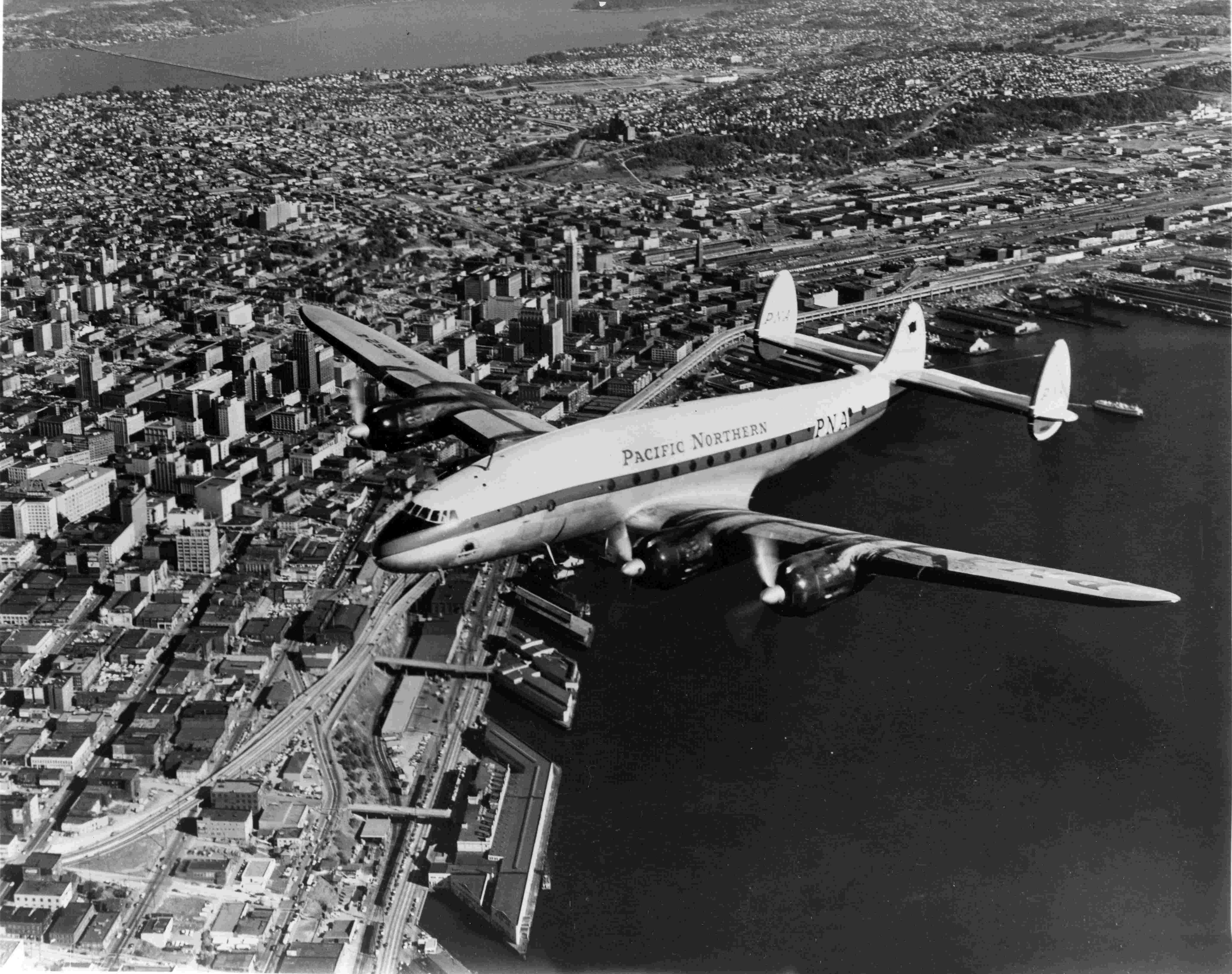 Climbing out of Seattle-Tacoma Airport on its scheduled late afternoon departure time in the Spring of 1959, Pacific Northern Airlines Constellation wings its way over downtown Seattle. Its final destination is Anchorage, but with a few stops along the way: Ketchikan, Juneau, Yakutat, and Cordova. Cost of the ticket from Seattle to Anchorage: $165.