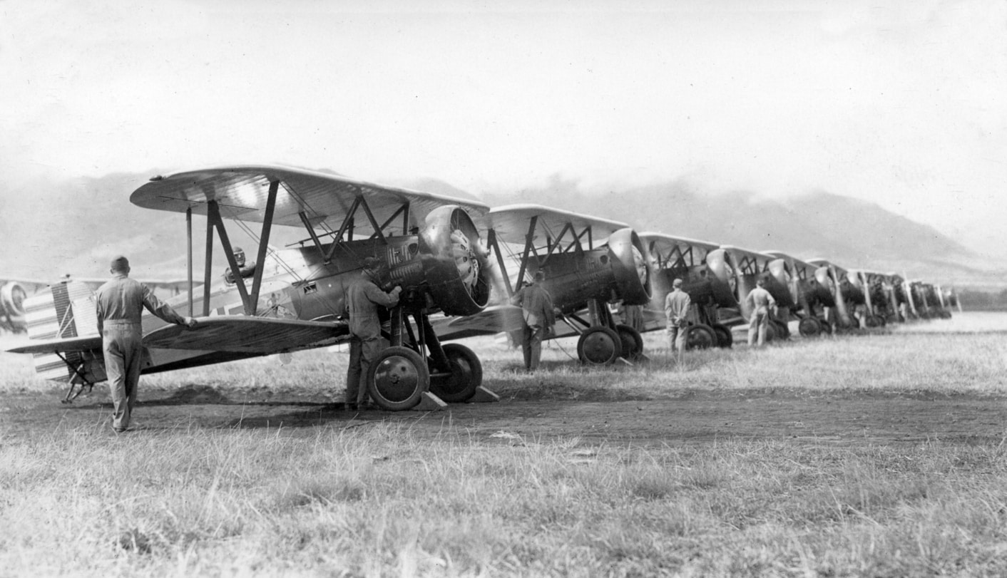 P-12s of the 18th Pursuit Group warming up at Wheeler Field.