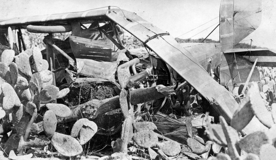 The photo’s caption says the crew of this DH-4 was “O.K.”. Well, that’s good, but despite having survived the crash, their troubles were not over: They have ended up in a field full of Opuntia ficus-indica, also known as the prickly pear cactus (“Panini” in Hawaiian). This no doubt caused a lot of cursing and swearing as the crew worked their way out of the field. Additional blasphemous language was supplied by the mechanics who arrived later to haul the wreck out of there.