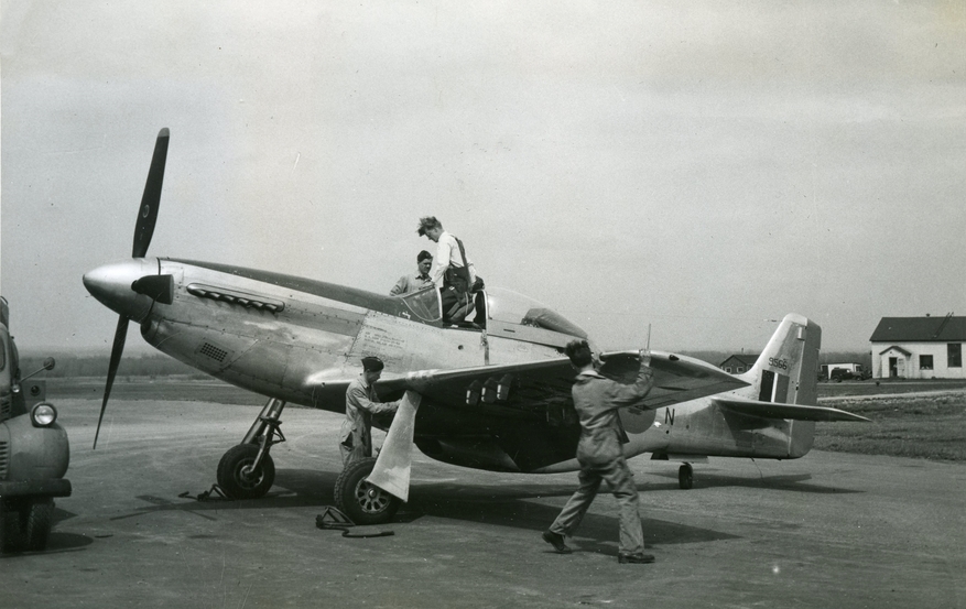 Starting life as P-51 44-73097, this Mustang was transferred to the RCAF in 1947 where it acquired the serial no. 9566. It sported the original blue and red RCAF roundel when this photo was taken at (probably) RCAF Station Chatham. Also noteworthy is the original USAAF data stenciled on the side. This aircraft crashed in 1953.