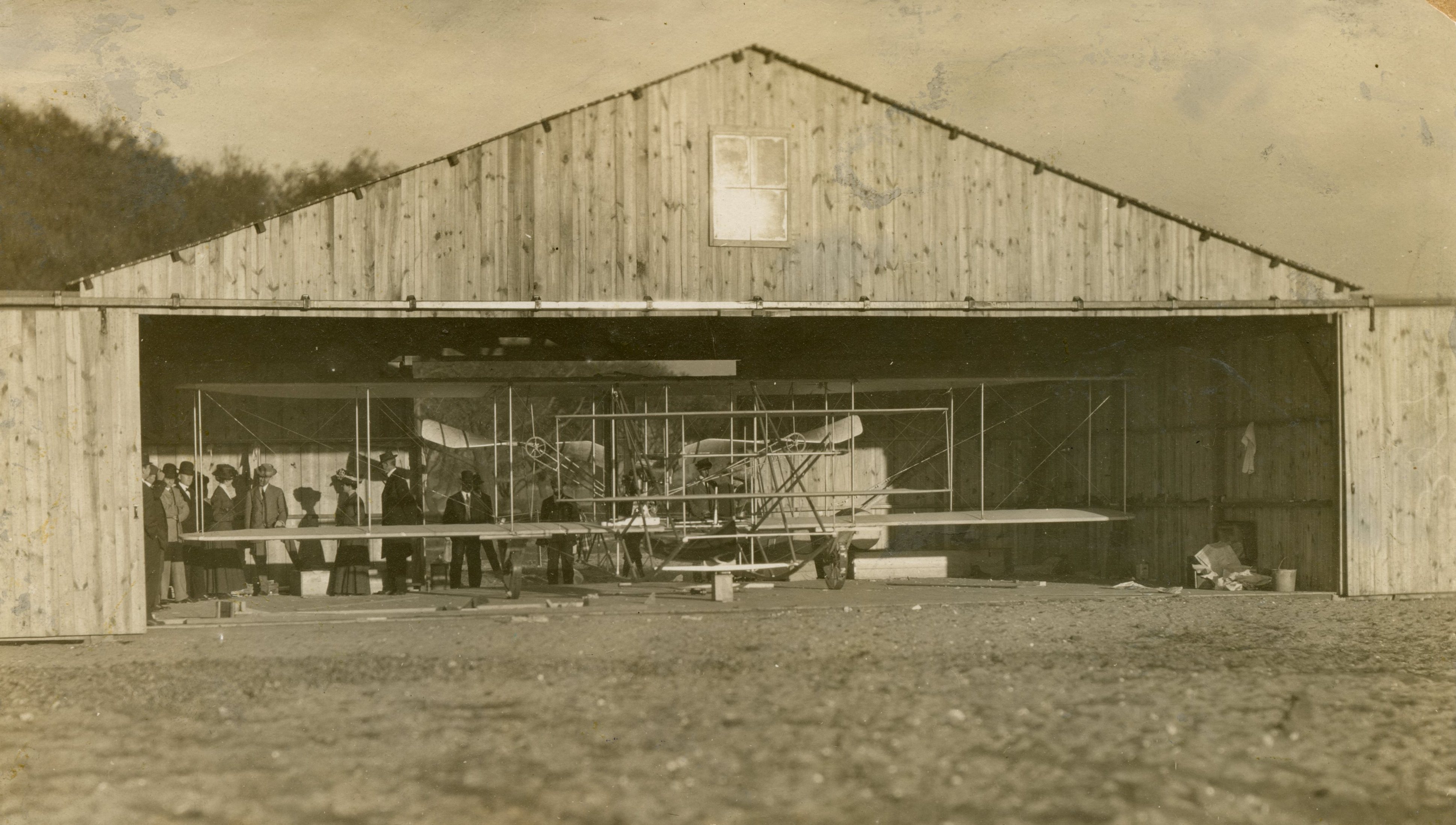 The next two photos show the Wright Flyer at Governors Island, NY, in September, 1910. The close-up sees Wilbur Wright explaining to a lady the finer points of the machine. With Orville recuperating from the Fort Myer crash, Wilbur carried on the brothers’s work. While at Governors Island, he undertook several flights the most famous being around the Statue of Liberty and New York harbor. If one looks closely, they can see the red canoe Wilbur strapped to the machine’s underside in case he had to ditch in that harbor. Ever the realist, Wilbur’s intent was not that the canoe would keep the aircraft afloat, but rather that it would make a water landing survivable – that set of forward elevators would have dug into the water and launched Wilbur right through them.