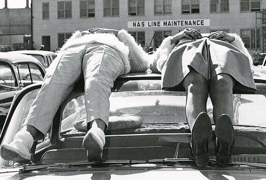 These fuzzy-sweater wearing air show fans picked out a pretty good spot to watch the Blue Angels at NAS Whidbey in the early 1960’s. Try this with today’s average car and there would be two human-shaped dents in the paper-thin tin can metal roof, whereupon the car manufacturer would be sued for not placing a warning in the owner’s manual to “Never lie on the roof of your vehicle, especially when it is in motion” etc. etc…